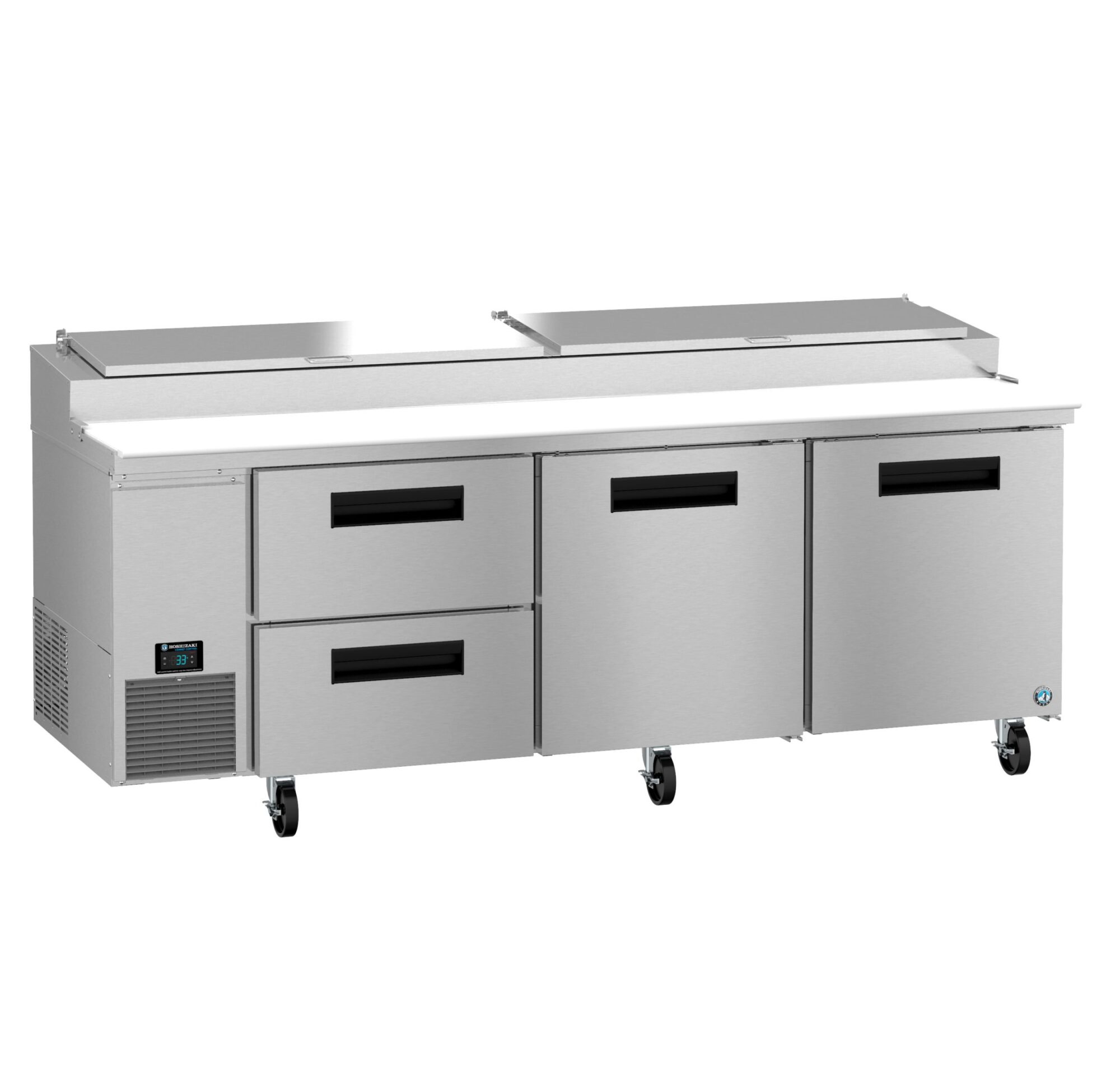 The PR93B-D2 is constructed of stainless steel, which protects this unit from minor damage and rust. Plus, it is easy to clean. The PR93B-D2 includes (12) polycarbonate plastic 1/3rd size pans, 4″ deep. drawer/door units are made to order. allow 4-6 weeks. Equipped with drawer slides constructed of 14 gauge stainless steel with durable delrin rollers. A 93″ x 19″ x 0.5″ thick white polyethylene cutting board is standard. Refrigerant flow is controlled with a capillary tube. The unit is ETL Safety (US & C) Listed, ETL Sanitation, Georgia Made Certified and includes a 7-7-7 Warranty (seven years labor, seven years parts, seven years compressor — visit hoshizakiamerica.com/support/warranty for eligibility information).